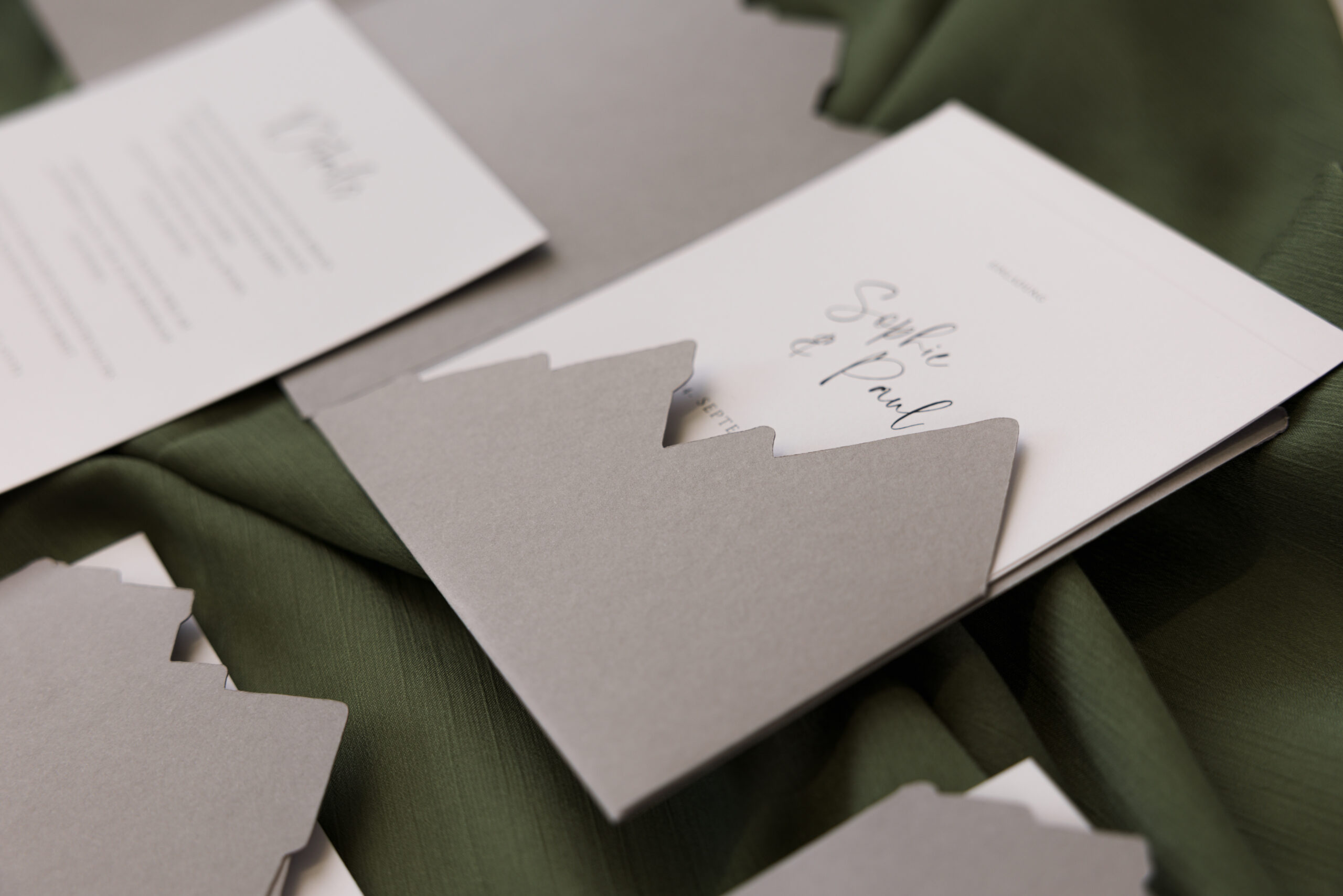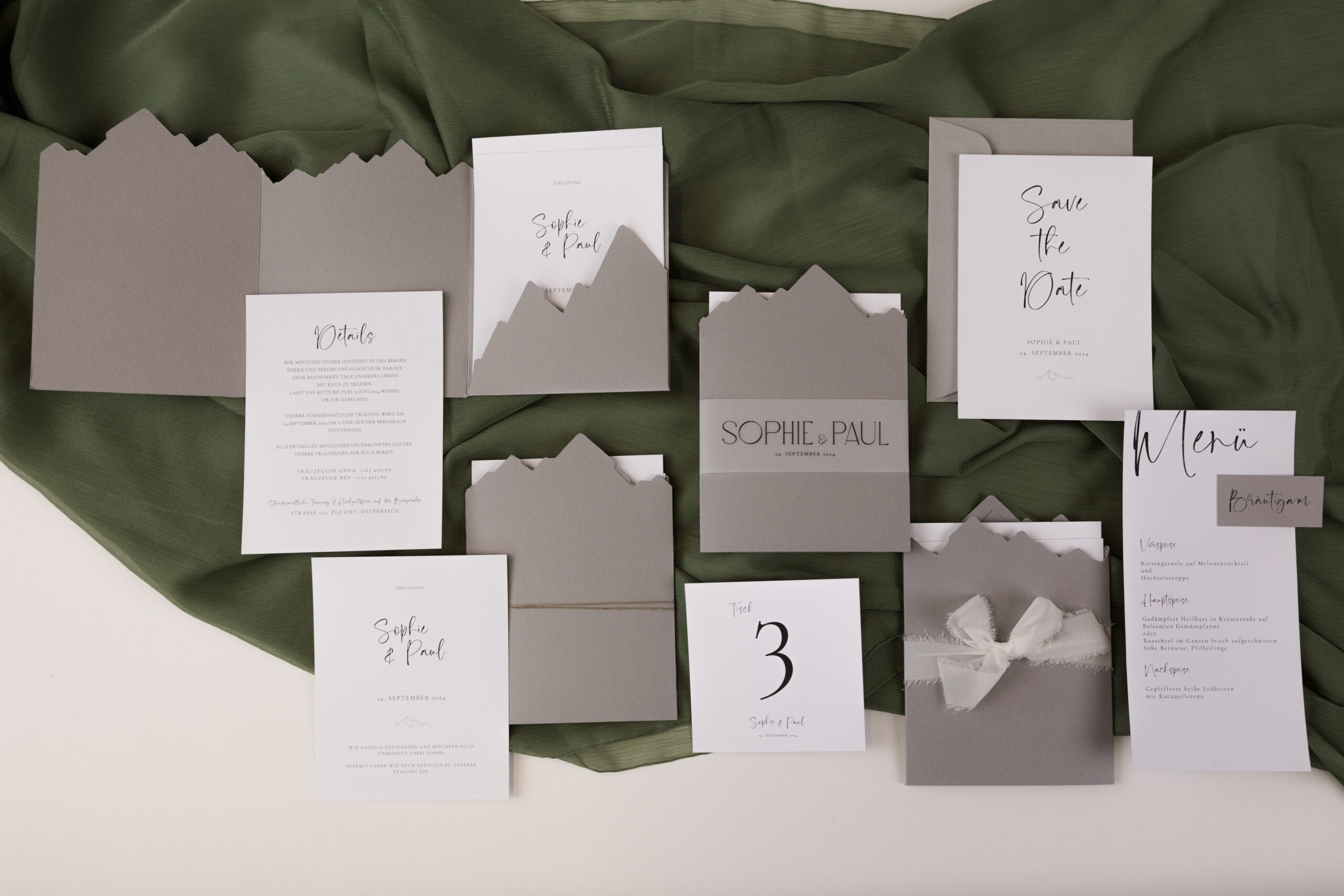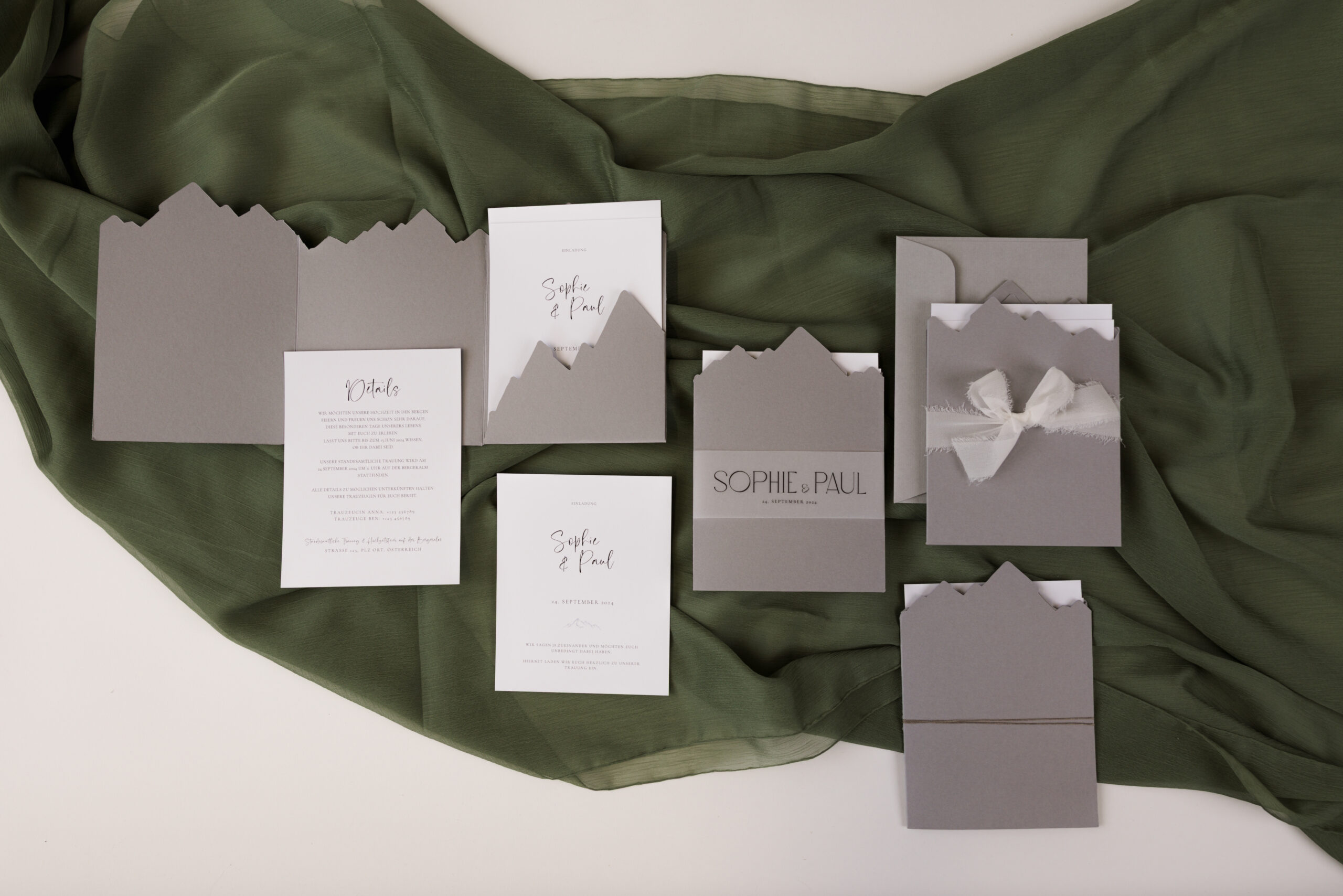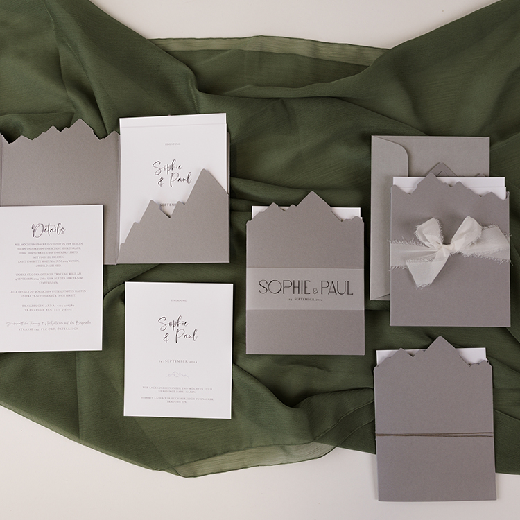 Die kunstvoll geschnittene Papiertasche in Bergform ist in den Farben Grau oder Natur erhältlich und sorgt schon beim Öffnen für Gänsehautmomente. Im Inneren warten zwei weiße Karten, die Raum für eure persönlichen Worte und liebevollen Details bieten.